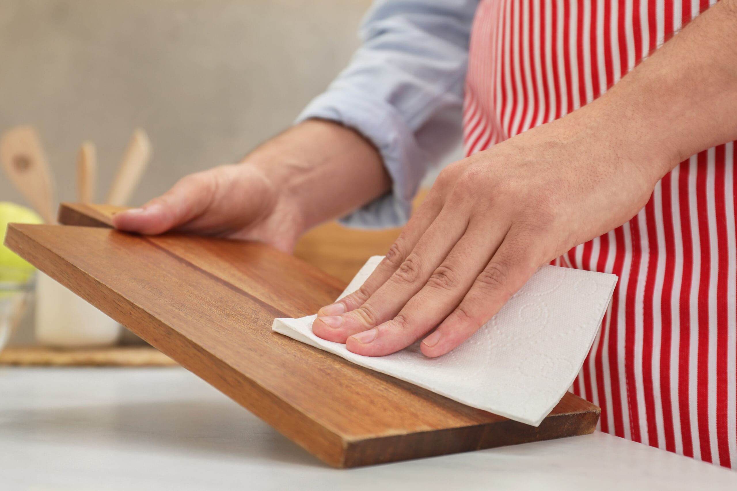 Finalmente, te recomiendo que cada uno o dos meses le apliques una fina capa de aceite mineral, también puedes usar aceite de coco, frótalo con tus manos limpias en el sentido de las fibras para mantener tu tabla hidratada. Así se mantendrá en excelente estado por mucho tiempo.